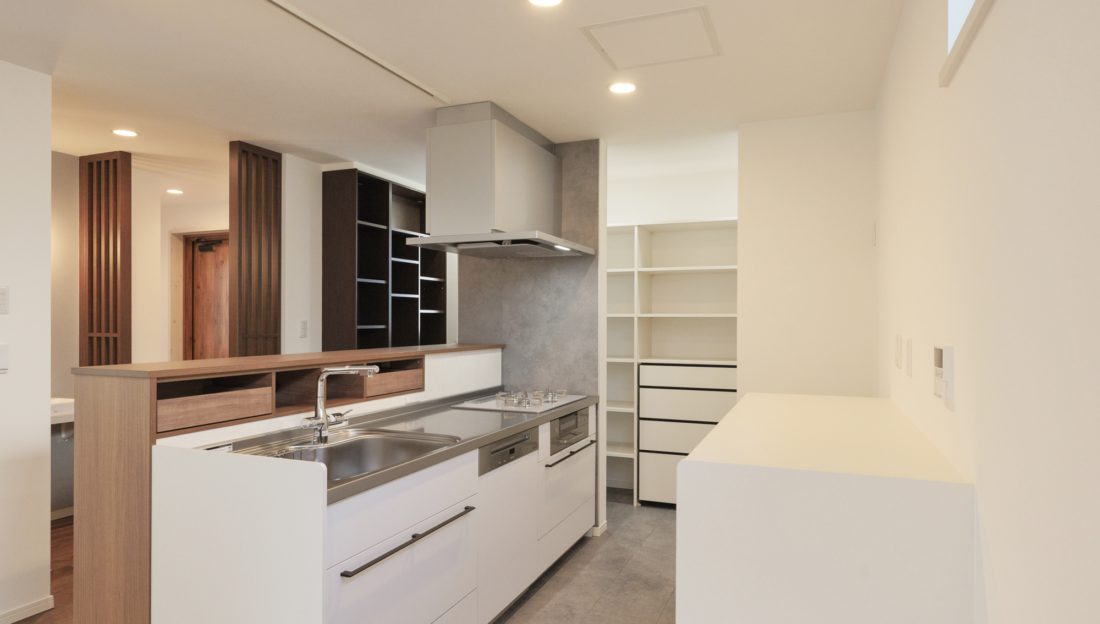 閉鎖的で収納の少ない壁付キッチンを腰壁のアクセントがオシャレな対面キッチンにリフ…