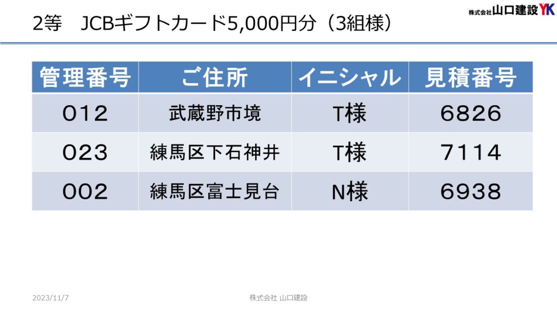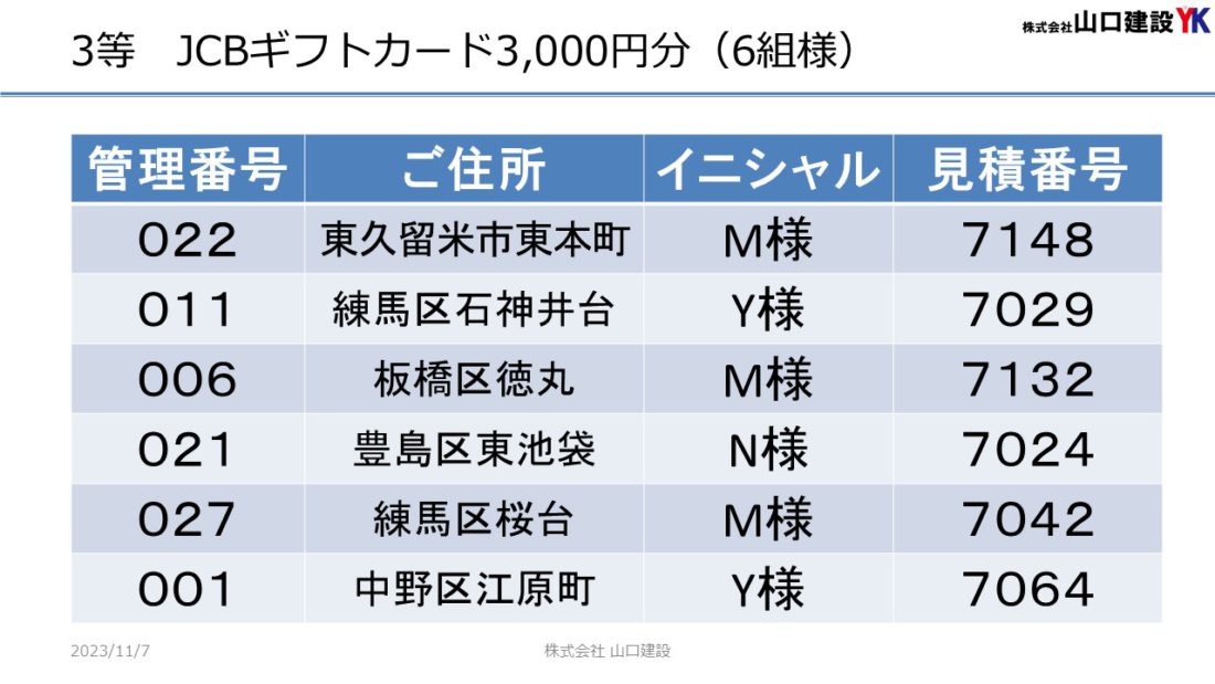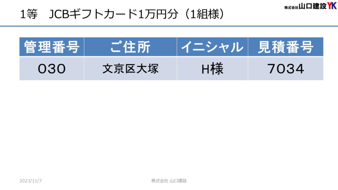 抽選結果に関しては、住所とイニシャル(姓)、お見積り番号の記載にて実施しています。