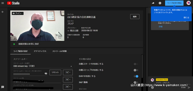 ZOOMの配信をYoutubeへ配信して、協力業者連絡会議をオンラインで開催しようと画策中です。